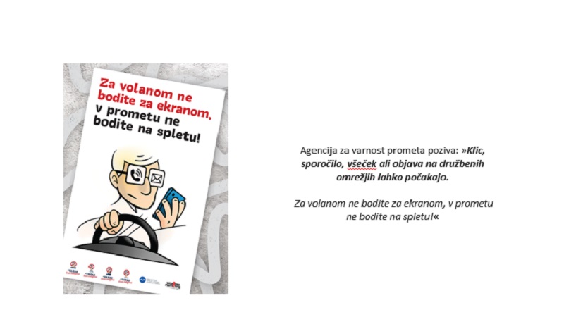 Agencija za varnost prometa s partnerji izvaja z nacionalno preventivno akcijo za ozaveščanje o tveganjih uporabe mobilnega telefona v prometu »Varno brez telefona« od 10. do 23. 1. 2022. Pomembno sporočilo Agencije za varnost prometa in partnerjev za voznike in starše otrok je, da za volanom ne bodite za ekranom, v prometu ne bodite na spletu!