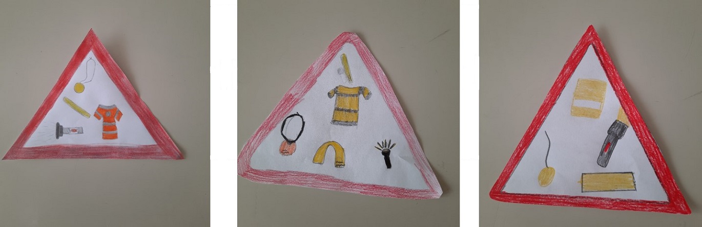 Učenci so po izvedenih spletnih delavnicah, ki smo jih izvedli v sodelovanju z Minicity, razmišljali s kakšnim prometnim znakom bi spodbudili udeležence v prometu, da naj uporabljajo odsevna telesa v prometu. Učenci so bili kreativni in predlagali naslednje prometne znake: