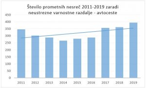 Podatki o vzrokih za nastanek prometnih nesreč izkazujejo, da je neustrezna varnostna razdalja med pogostejšimi vzroki, lani se je pripetilo 2.021 takšnih prometnih nesreč. Delež prometnih nesreč kot posledica neupoštevanja varnostne razdalje v zadnjem desetletju (2011-2019) ostaja skorajda enak (giblje se med 10 in 11 odstotkov).