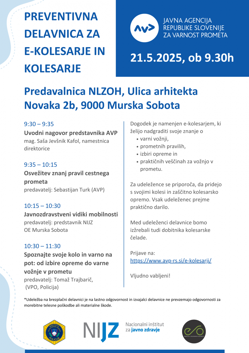 v sredo, 21. maja 2025, ob 9.30, bo v predavalnici NLZOH (Ulica arhitekta Novaka 2b, Murska Sobota) potekala brezplačna preventivna delavnica za e-kolesarje in kolesarje, ki jo organizira Agencija za varnost prometa v sodelovanju s partnerji.