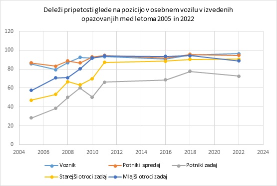 Spodnja tabela in graf prikazujeta deleže pripetosti glede na pozicijo sedenja v osebnem avtomobilu v izvedenih opazovanjih med letoma 2005 in 2022.