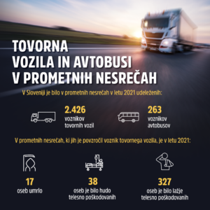 Kljub manj ugotovljenim kršitvam pa so bili v letu 2021 vozniki tovornih vozil udeleženi v 2.426 prometnih nesrečah oz. v vsaki 7. prometni nesreči na slovenskih cestah. Povzročili so jih 1.537, oziroma 63 % od vseh nesreč, v katerih so bili udeleženi. V primerjavi z letom 2020, ko so povzročili 1.409 od 2.183 prometnih nesreč, je to 9 % več. V posledicah teh nesreč je življenje lani izgubilo kar 17 oseb (6 v 2020), 38 je bilo hudo poškodovanih (26 v 2020), 327 pa lažje poškodovanih (339 v 2020). Med vozniki tovornih vozil je bilo pet smrtnih žrtev (v 2020 dve), 11 je bilo hudo telesno poškodovanih (kar 83 % več kot v letu 2020) in 117 lažje telesno poškodovanih, enako kot v letu 2020.